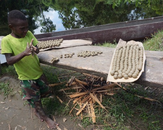 Sago ist eine Palme. Aus der Rinde werden die Bilder an den spirituellen Häusern gemalt. Das Mark der Palme wird herausgehauen und durch das Auswaschen entsteht ein Pulver, das dann wiederum als eine Art Fladen essbar gemacht wird.
