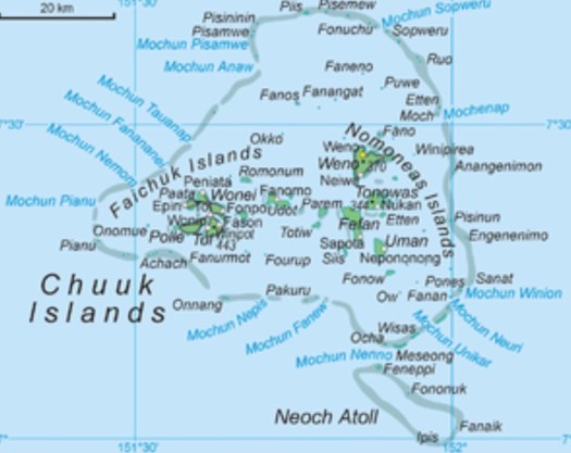 Die Insel Chuuk gehört zu den föderalistischen Staaten Mikonesiens. Chuuk umfasst 98 Inseln wo von nur ca 4 wirklich bewohnt sind. Ca 98 km/2 umfasst die Inselgruppe. Der Höchste Punkt ist 443 m/ü Meer. Auf den Inseln leben ca 40’000 Einwohner.