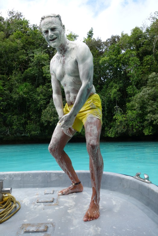 Als erstes der Milky Way. Eine Bucht umrahmt von dicht bewaldeten Inseln. In dieser Bucht war das Wasser ganz milchig… Ich fragte mich warum und tauchte schnell auf den Grund der Lagune. Alles Weiss, eine Art Mörtel mit dem man sich einschmieren konnte. Eine wunderbare Alternative zum Schlammbad oder einem herkömmlichen Spa. Alle auf dem Schiff schmierten sich zur eigenen und allgemeinen Belustigung damit ein. Die morgendlich ruhige Stimmung wich schlagartig und alle fingen an miteinander zu sprechen. Na ja, die Japaner hatten mal wieder grosse Probleme mitzuhalten, aber mit Händen, Füssen und sehr viel Schlamm, ging es dann doch.