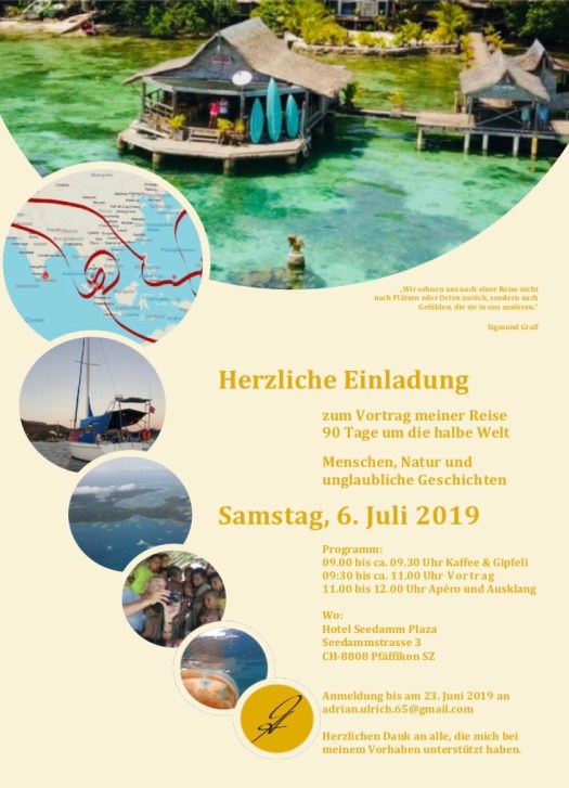 Aber bevor ich wieder aufbreche, um die Welt zu erkunden, lade ich Dich / Euch herzlichst zu Kaffee & Gipfeli ein. Gleichzeitig, erzähle ich gerne, in einem Vortrag, über meine Vorbereitungen, Abenteuer, Erlebnisse aber auch was davon geblieben ist.